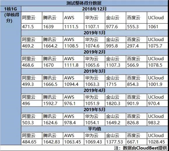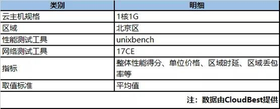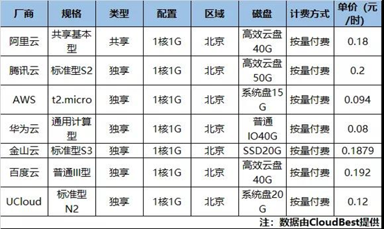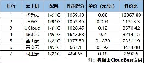 说明:各家云服务商均有不同区域不同可用区,针对基础入门级云主机用户选型需求,本次选型测试数据仅选用同一区域同一配置通用类型云主机,即阿里云华北2(阿里云华北2地处北京,以下简称“阿里云”),腾讯云北京区(以下简称“腾讯云”),AWS北京(以下简称“AWS”),华为云北京区(以下简称“华为云”),金山云北京区(以下简称“金山云”),百度云北京区(以下简称“百度云”),UCloud云北京区(以下简称“UCloud”)区域的云主机产品,且7家云服务商均选取了1核1G配置的云主机,所以文中涉及到的整体数据,均为同一种配置云主机的平均值。